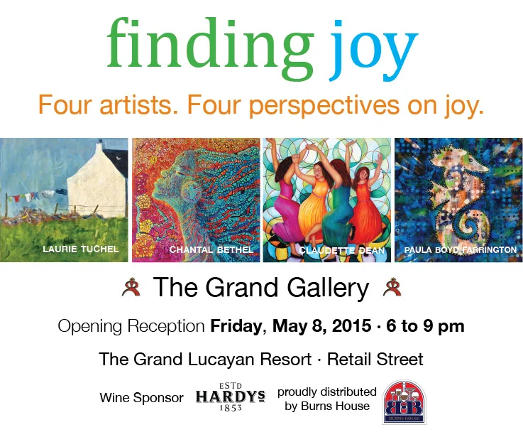 Delighted to be a part of the Finding Joy art exhibition on view through August 31, 2015 at The Grand Gallery on Retail Street at Grand Lucayan Resort, Grand Bahama Island. See my works and the art of Chantal Bethel, Claudette Dean, and Laurie Tuchel. For more information or directions to The Grand Gallery, call 242.373.6111.
